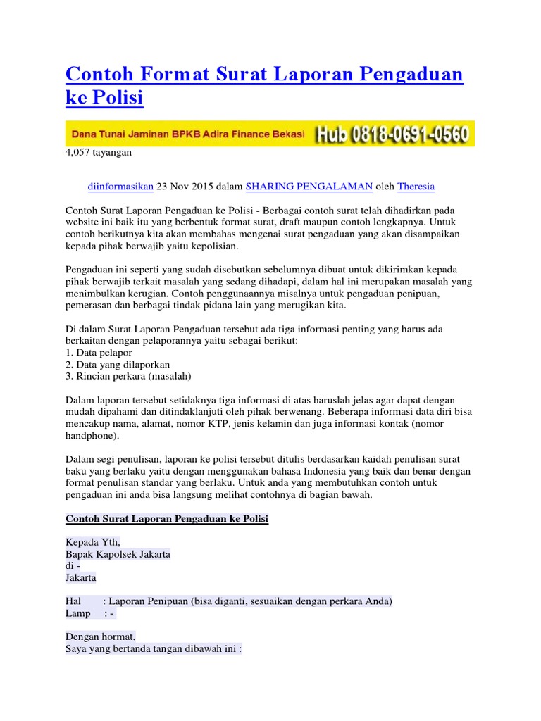Pada bagian bawah dari surat pernyataan ini juga terdapat tanda tangan lurah setempat. Namun ada kalanya pernyataan yang akan diberikan harus dengan menggunakan surat, baik itu menyatakan diri sendiri ataupun menyatakan tentang orang lain. Bagi anda yang ingin menulis surat pernyataan dengan cepat, maka anda bisa copy dan pastekan di microsoft word untuk selanjutnya diisi dengan data diri anda sendiri. Surat pernyataan sendiri memiliki beberapa jenis, seperti surat pernyataan kerja, surat pernyataan kesanggupan, surat pernyataan belum menikah, dan masih banyak lagi yang lain. Contoh surat laporan selanjutnya adalah contoh surat yang umumnya digunakan oleh banyak masyarakat untuk memberikan laporan terkait penipuan yang dilakukan oleh suatu oknum.